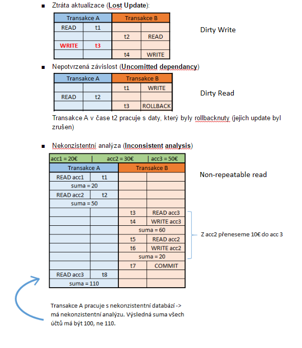 - Read + Write => Nekonzistentní analýza = Probíhá sekvence čtení, již přečtené záznamy se ovšem mohou vlivem jiné transakce změnit a výsledkem je nekonzistence.