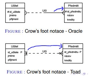 Modrá šipka znázorňuje povinnost vazby a k jaké tabulce se vztahuje. Znázorněný diagram v obou případech popisuje, že učitel musí mít předmět.