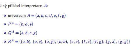 - Interpretace = každému predikátovému symbolu je určena nějaká n-ární relace z daného Universa